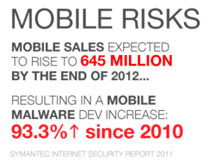 One increasing risk, as many know, is mobile, due in part to increasing smartphone user growth – Gartner predicts sales to hit 645 million by the end of 2012. This means an increase in mobile malware that can collect, send or track data (93.3% increase in mobile vulnerabilities since 2010). Mobile devices are also at risk for loss or theft; if personal or confidential company/client data is stored locally on your device, this can result in a data breach.