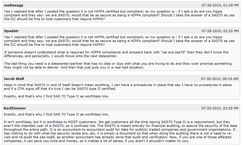 But in more educated and popular hosting forums, there appears to be consensus that SAS 70 is not an indicator of HIPAA compliant data centers (click for larger):